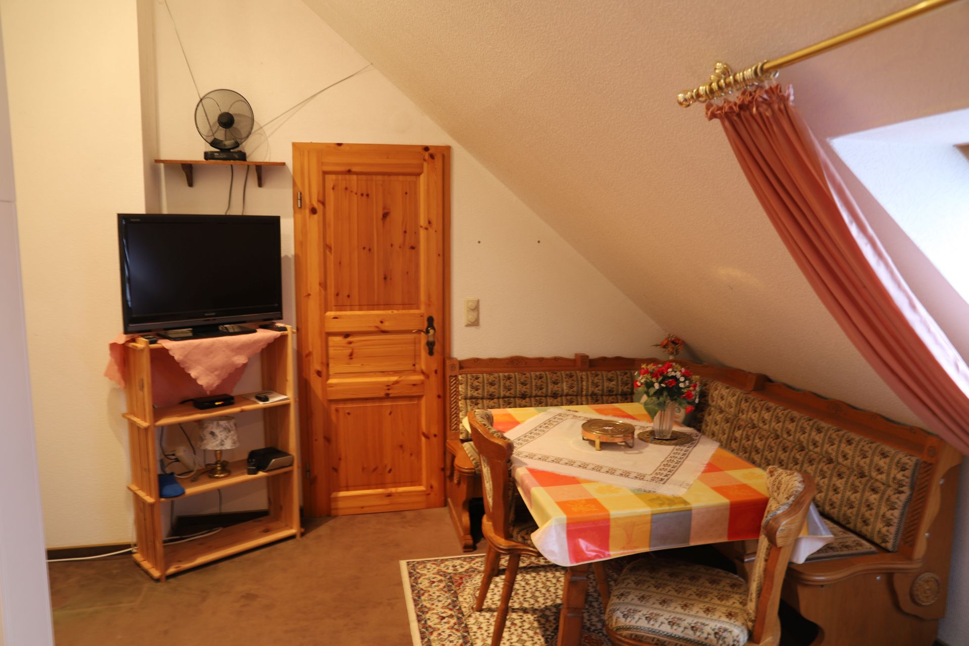 Rustikales Einbettzimmer mit Sitzecke.