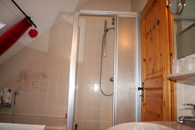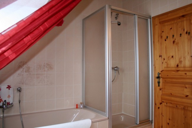 Das geräumige Bad mit Dusche und Badewanne.