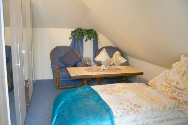 Das blaue Schlafzimmer mit Sitzgruppe.