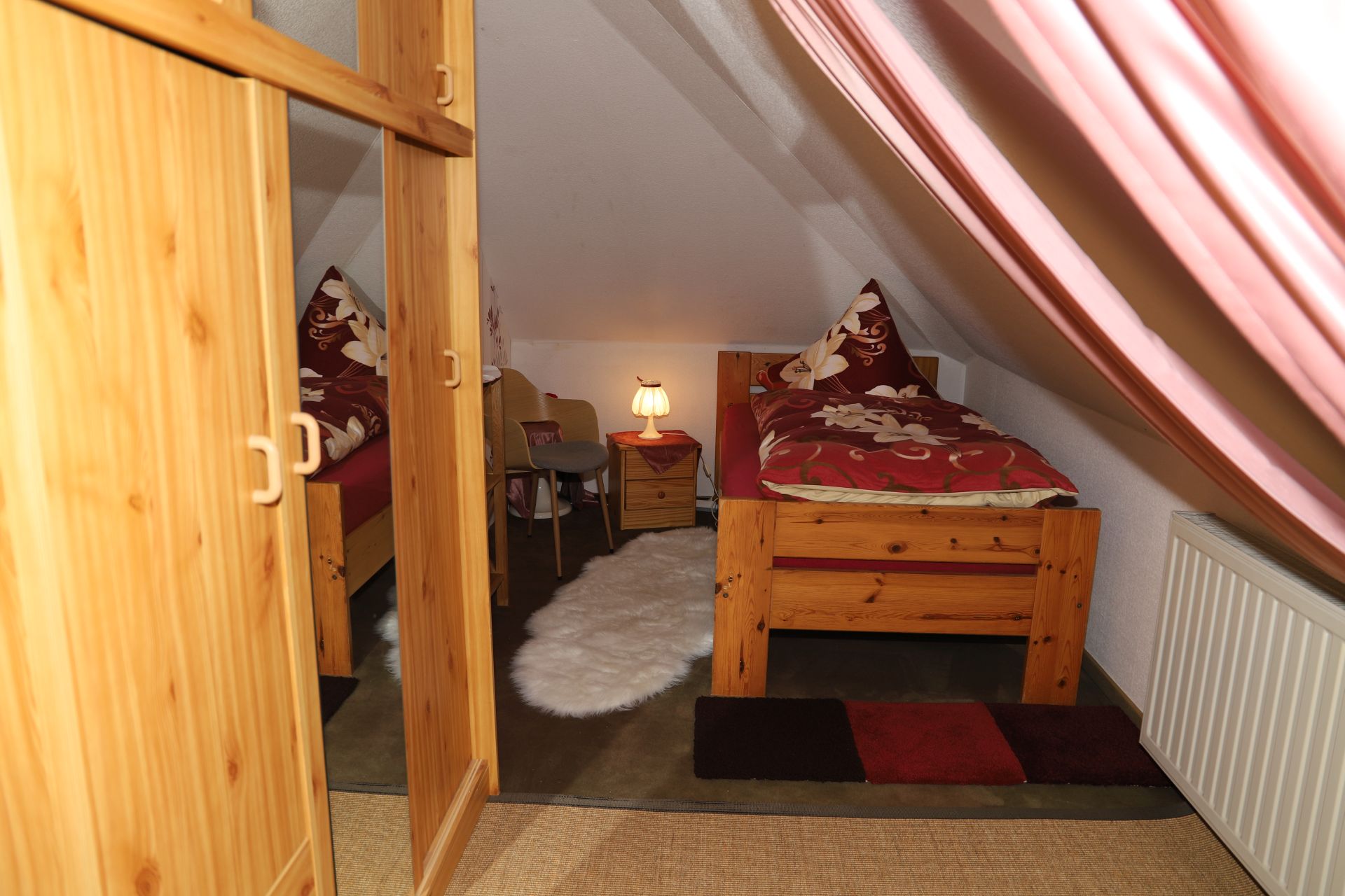 Rustikales Einbettzimmer mit Sitzecke.